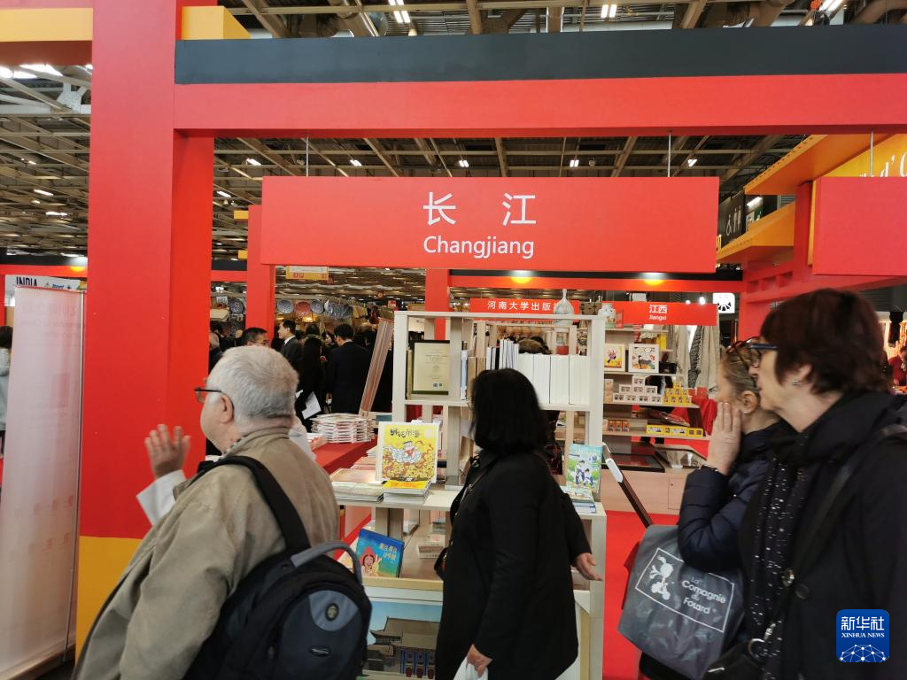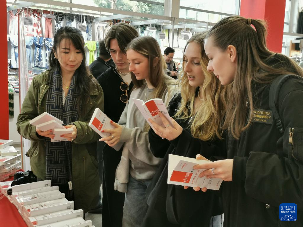 4月27日,觀眾在法國巴黎博覽會中華文化主題展區瀏覽《中國關鍵詞》系列圖書。新華社記者 徐永春 攝
