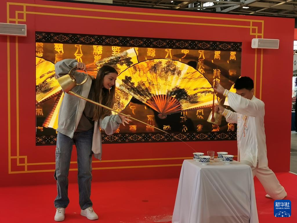 4月27日,一名觀眾在法國巴黎博覽會中國文化主題展區體驗“長嘴壺茶藝”。