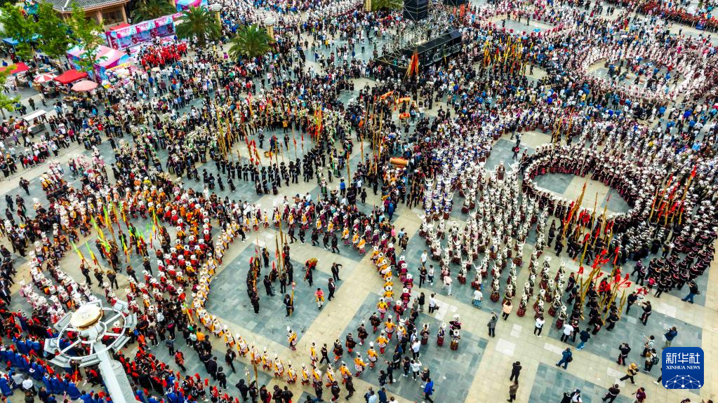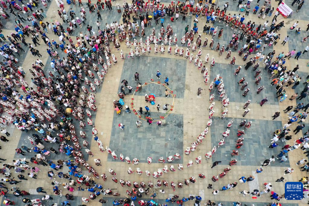 5月2日,人們在貴州省臺江縣姊妹廣場參加苗族姊妹節盛裝活動(無人機照片)。