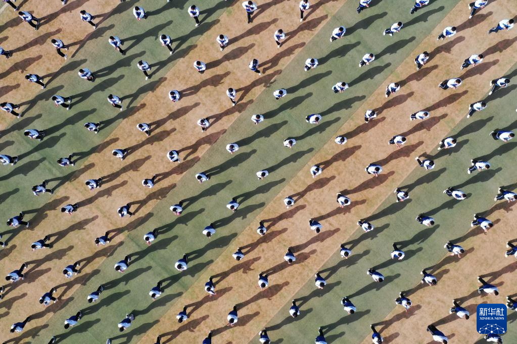 敦煌中學的學生在操場上做敦煌舞課間操(4月26日攝,無人機照片)。