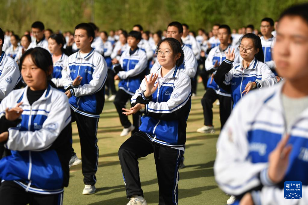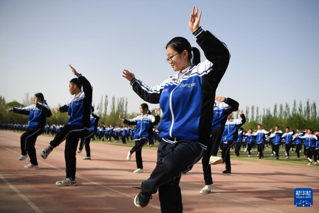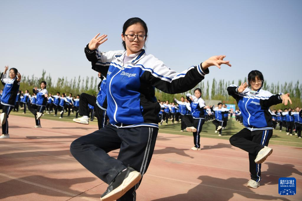 敦煌中學的學生在操場上做敦煌舞課間操(4月26日攝)。