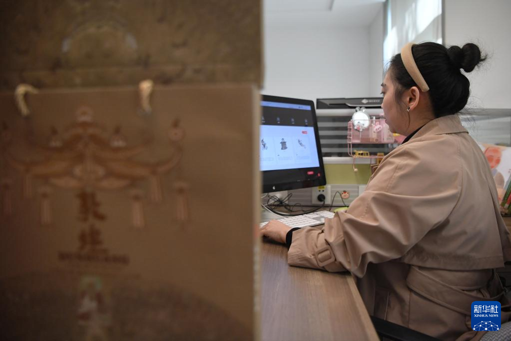敦煌研究院文物數字化保護團隊創意營銷人員廖雪婷在整理文創產品(4月25日攝)。