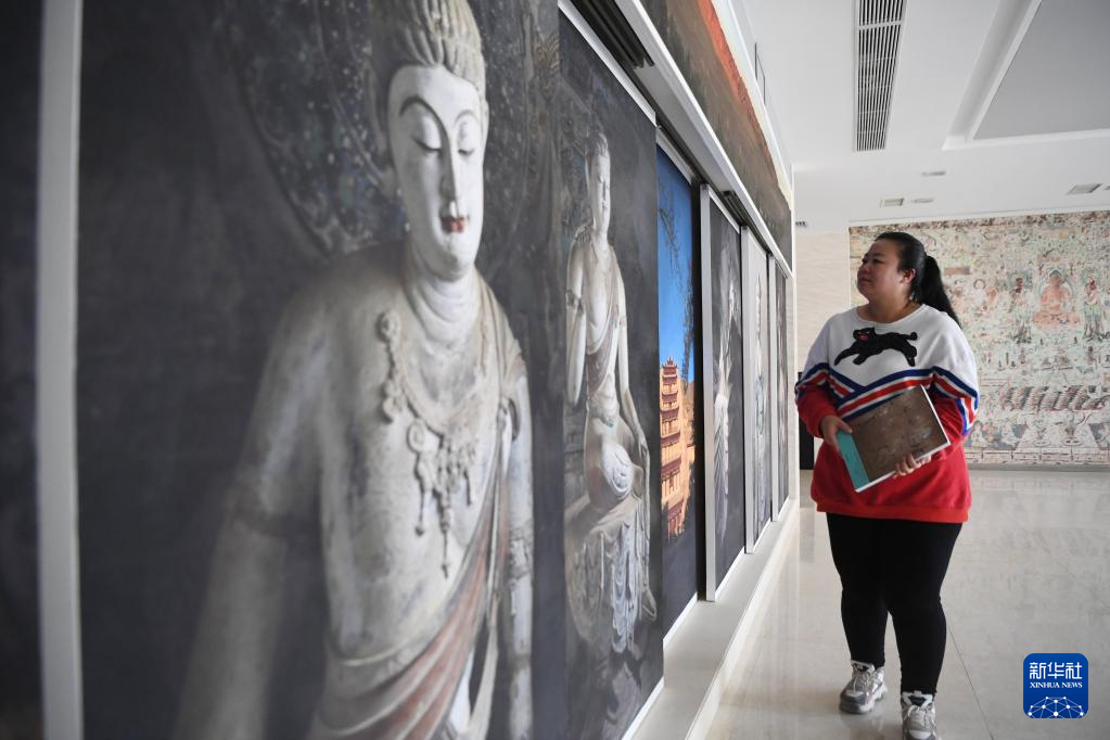 敦煌研究院文物數字化保護團隊圖像處理人員年海麗從莫高窟照片墻前走過(4月25日攝)。