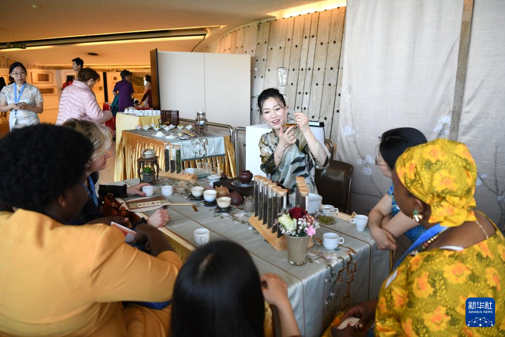 5月2日,中國茶藝師在瑞士日內瓦萬國宮講解中國茶。新華社記者 連漪 攝