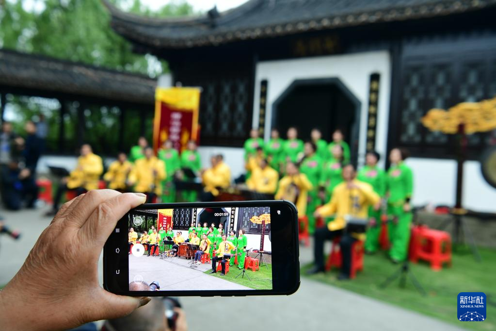 5月6日,國家級非遺項目邵伯鑼鼓小牌子表演團在江蘇省揚州市江都區邵伯鎮斗野園表演。