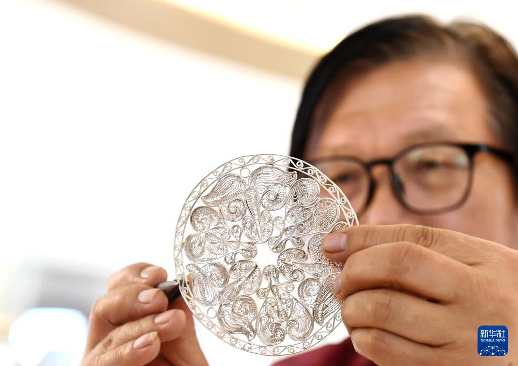 5月6日,國家級非遺項目江都金銀細工制作工藝師在江蘇省揚州市江都區萬達廣場的非遺文化展示區向游客展示金銀制作工藝。