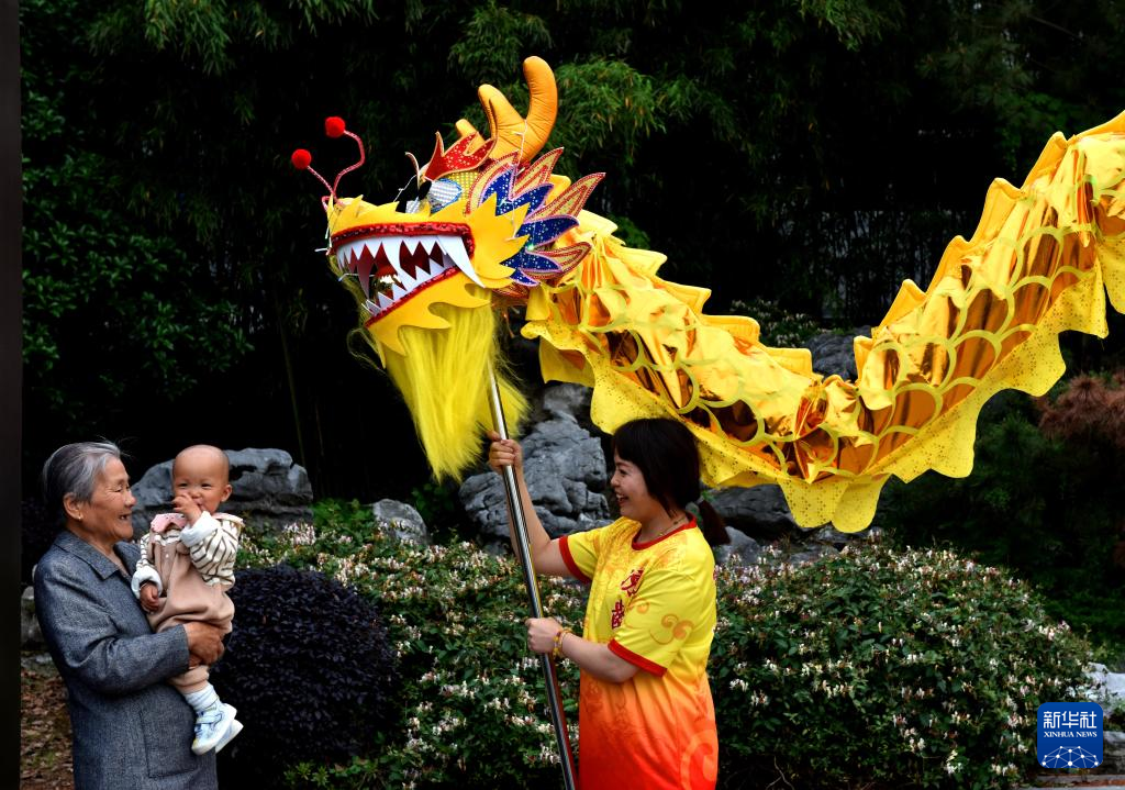 5月6日,江蘇省揚州市江都區邵伯鎮的邵伯龍舞隊員與游客互動。