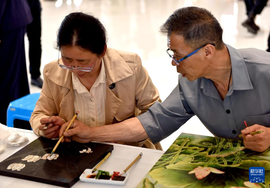 5月6日,游客在江蘇省揚州市江都區萬達廣場的非遺文化展示區向國家級非遺項目揚州漆器髹飾技藝師學習漆器髹飾技藝。