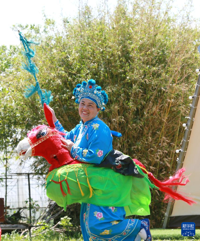 5月7日,江蘇省級非遺項目吳橋社火表演隊在江蘇省揚州市江都區吳橋鎮白塔河生態度假莊園為游客表演。