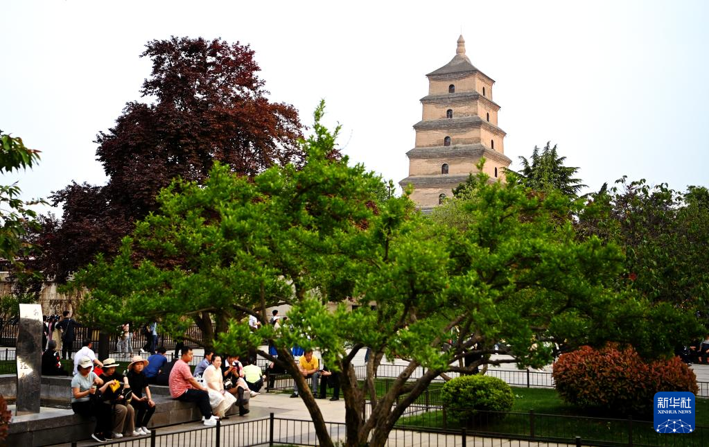 游客在西安大雁塔下游覽(5月1日攝)。