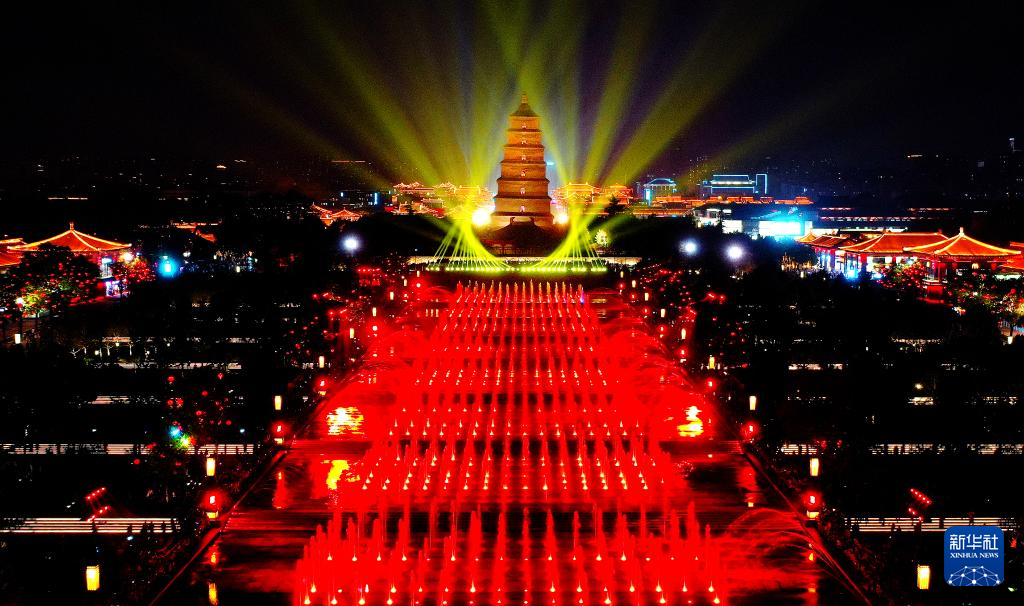 游人在西安大雁塔北廣場觀賞音樂噴泉表演(4月18日攝,無人機照片)。