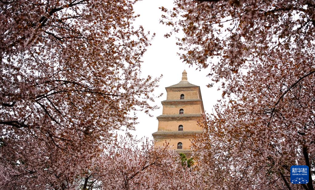 春花掩映中的西安大雁塔(4月1日攝)。