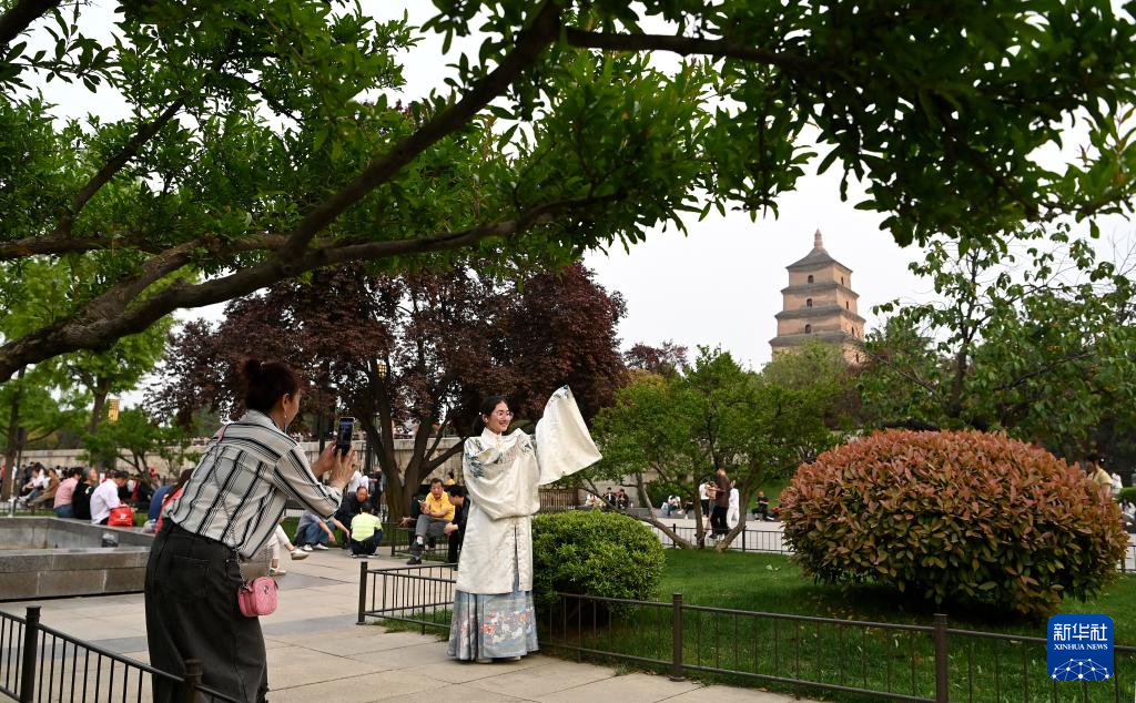 游客在西安大雁塔北廣場游覽留影(4月18日攝)。