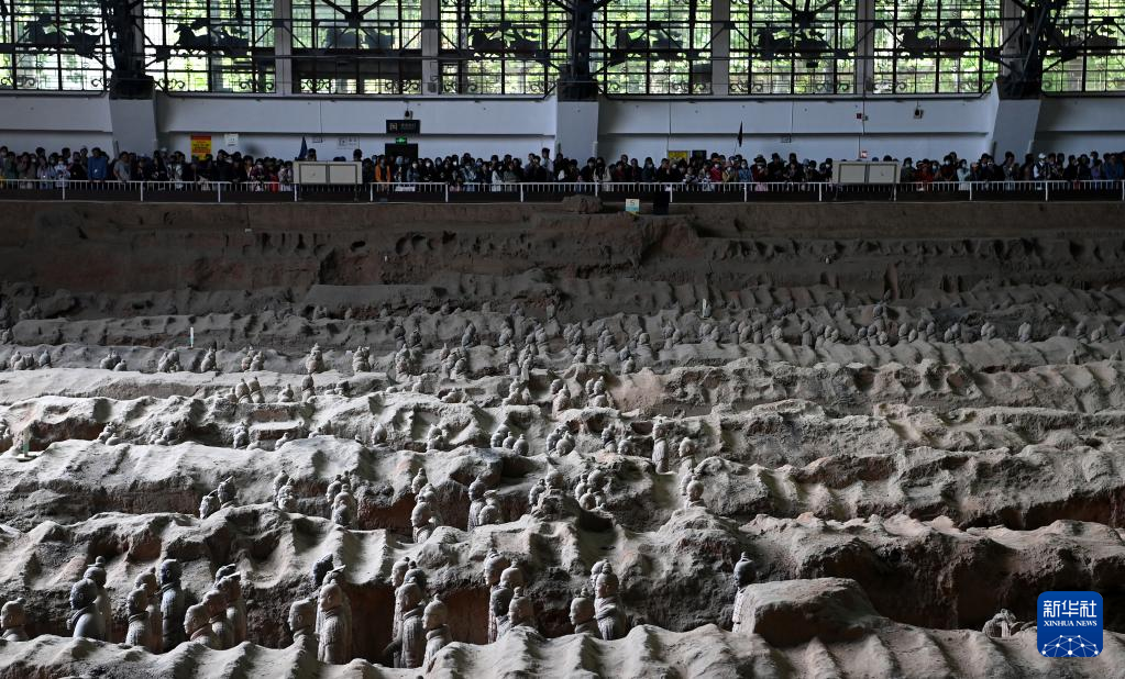 游客在秦兵馬俑一號坑遺址參觀(4月26日攝)。