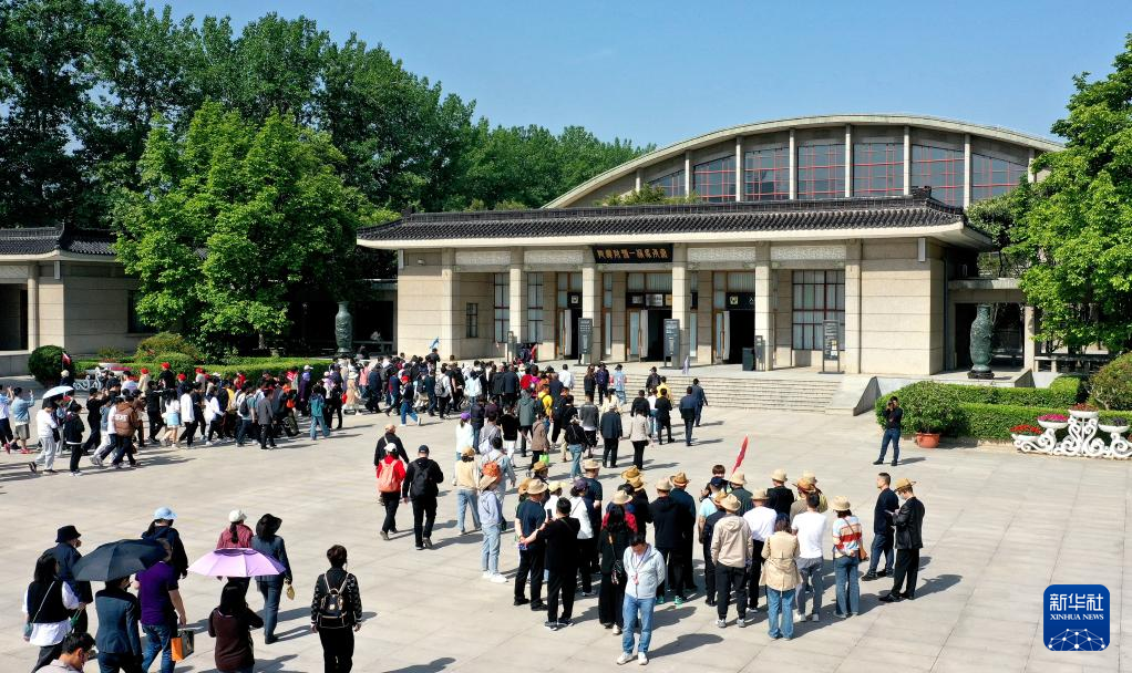 游客前往秦兵馬俑一號坑遺址參觀(4月26日攝,無人機照片)。