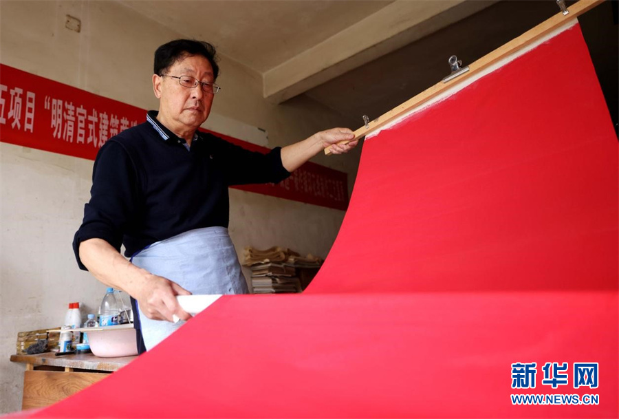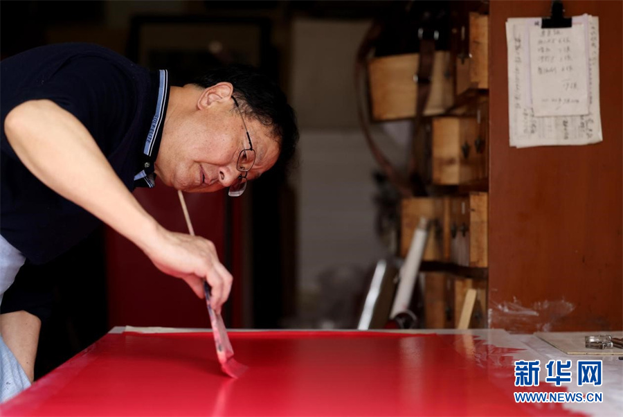 近日,宮廷描金紙省級非遺傳承人范發生在工作室進行紙張染色。