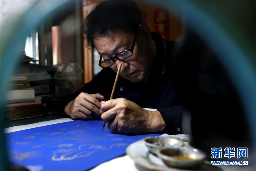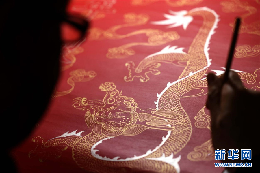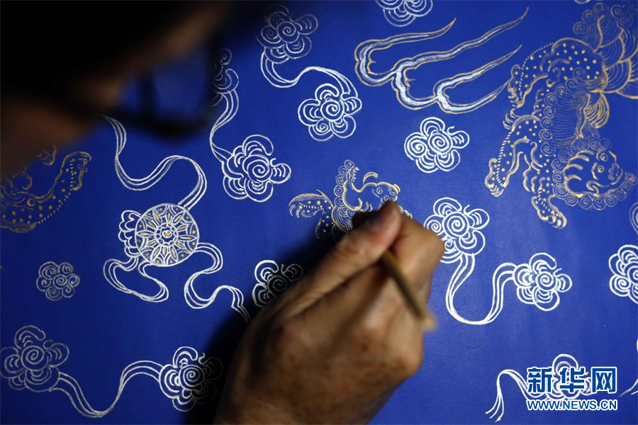 近日,宮廷描金紙省級非遺傳承人范發生在進行描金紙畫稿拷貝。