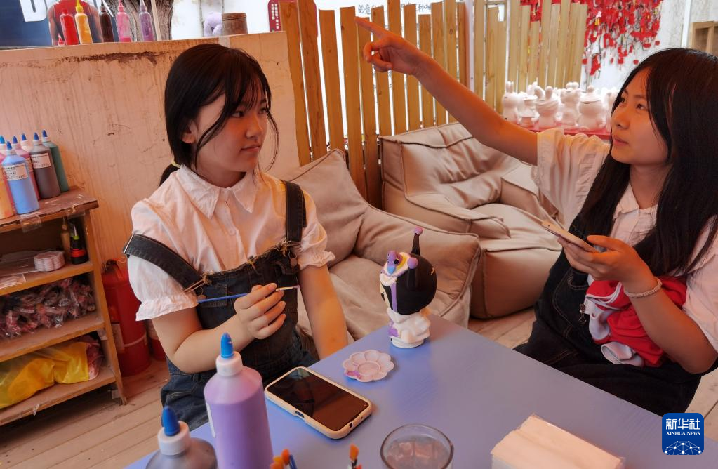 5月10日,兩名年輕人在山東濟寧環西北里文創街區體驗手工項目。