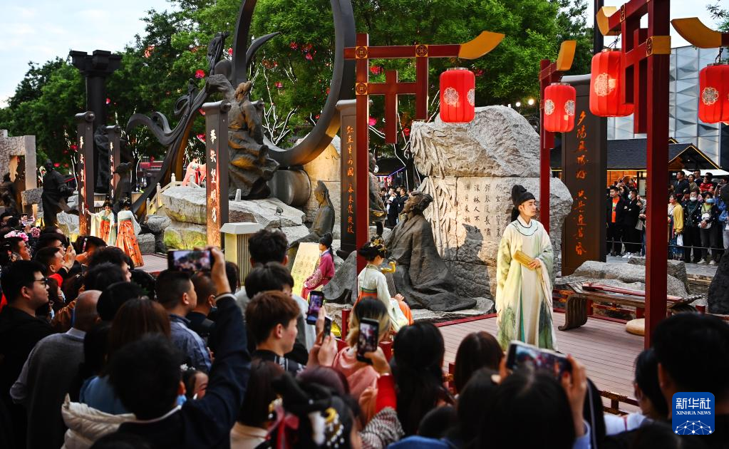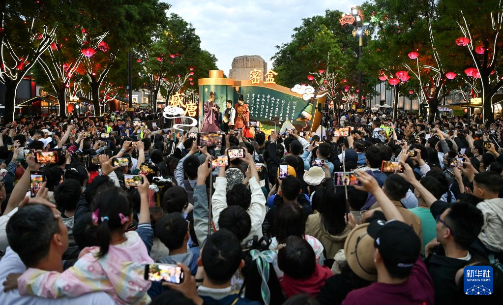 游客在西安大唐不夜城觀看演出“詩歌藝術”(5月8日攝)。