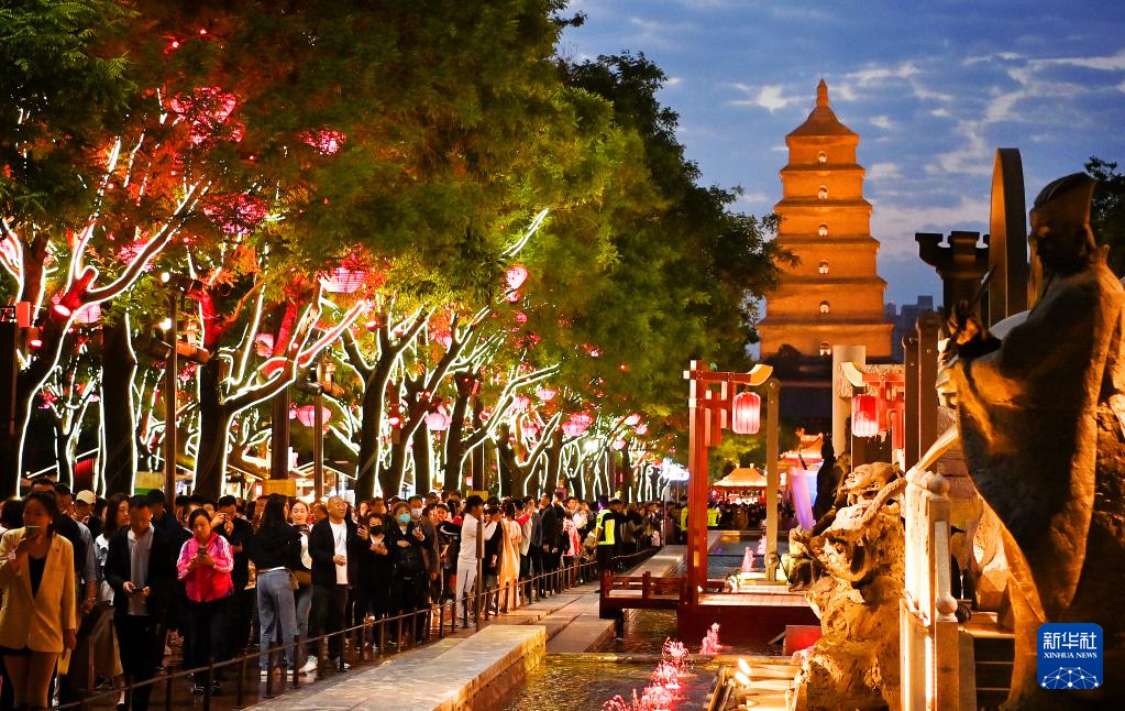 作為西安文化地標之一的大唐不夜城,位于西安市大雁塔腳下,南北總長2100米,東西寬500米。漫步大唐不夜城步行街區,仿唐建筑飛檐斗拱、層樓疊榭;華燈初上后燈火璀璨、游人如織。白居易筆下的雁塔題名、詩仙李白的醉酒吟詩、古詩古畫中的簪花仕女、青史留名的房謀杜斷……散落在史書典籍中的故事遺珠,通過現代舞蹈、真人演繹、現場互動等形式,再次呈現在世人面前。千米長街一步一景,傳統與時尚精彩碰撞、古老與現代相得益彰。