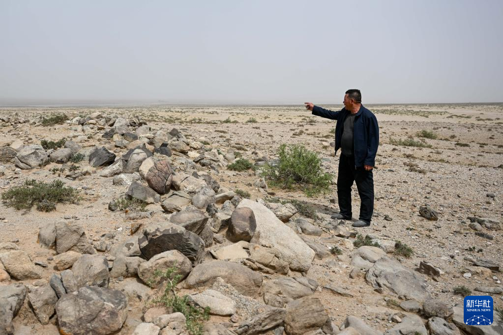 5月13日,駝峰(長城)文物保護隊員許繼龍在巡查阿拉善左旗一處石圈遺址。