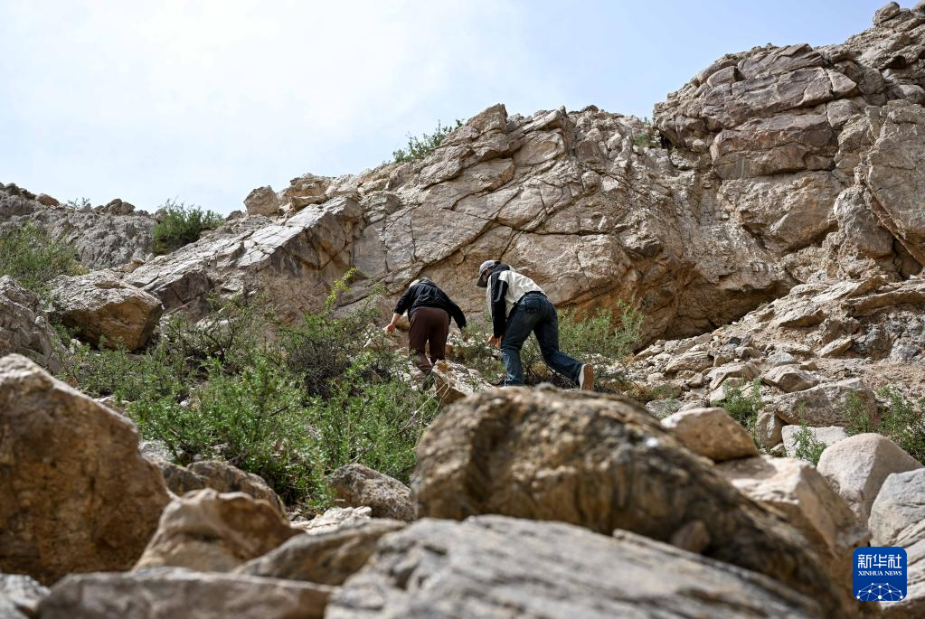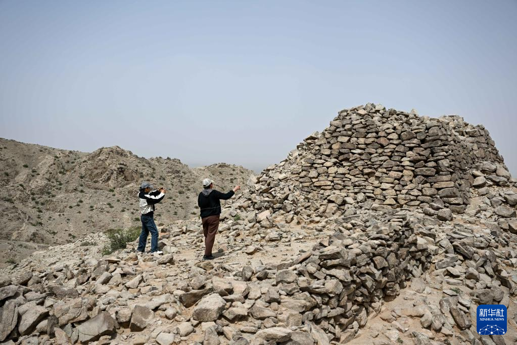5月13日,駝峰(長城)文物保護隊員許繼龍(右)和烏仁其其格在巡查阿拉善左旗一處石圈遺址。