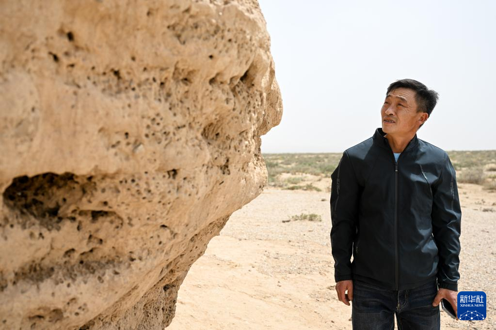 5月13日,駝峰(長城)文物保護隊員布音烏力吉在阿拉善左旗一處烽火臺遺址巡查并拍照記錄。