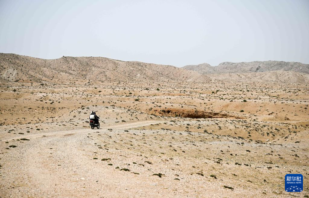 5月13日,駝峰(長城)文物保護隊員騎著摩托車在阿拉善左旗一處戈壁灘上行駛。