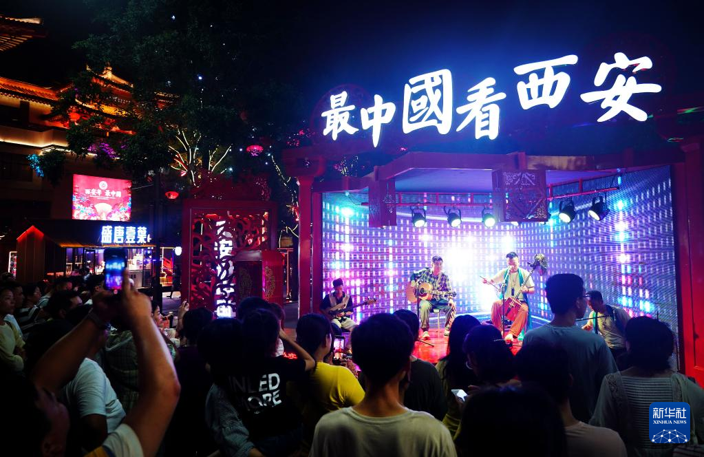 游客在西安大唐不夜城步行街觀看音樂演出(2019年8月8日攝)。