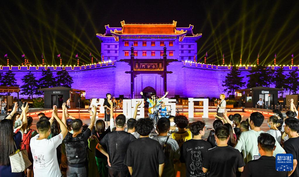 游客在西安城墻永寧門廣場欣賞樂隊演出(2022年8月1日攝)。