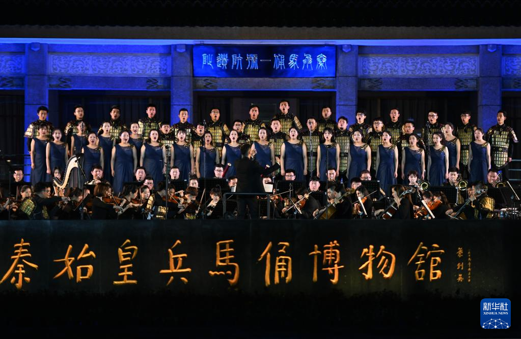 在國際博物館日“奇跡之夜”音樂會上,西安交響樂團合唱團在秦兵馬俑一號坑遺址前演唱(2019年5月18日攝)。