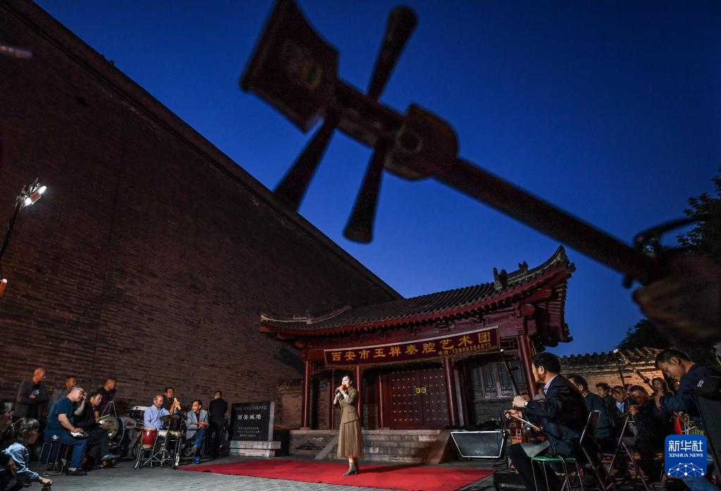 2023年5月12日,西安市玉祥秦腔藝術團成員在西安城墻玉祥門外表演秦腔。