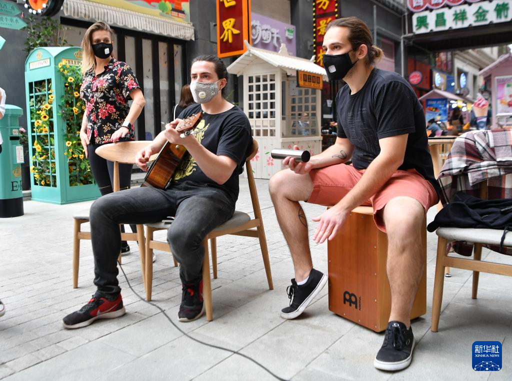 2020年4月16日,一支來自巴西的樂隊在西安市未央區一處商業街區進行戶外表演。