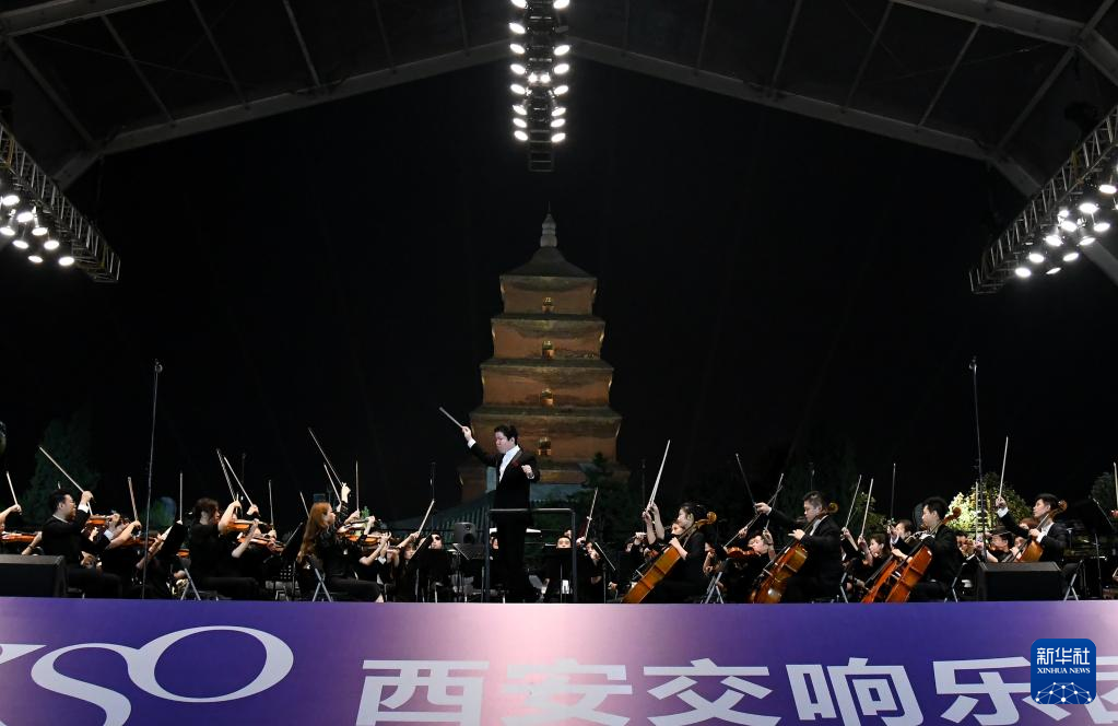 西安交響樂團在西安大雁塔北廣場戶外公演(2020年9月19日攝)。
