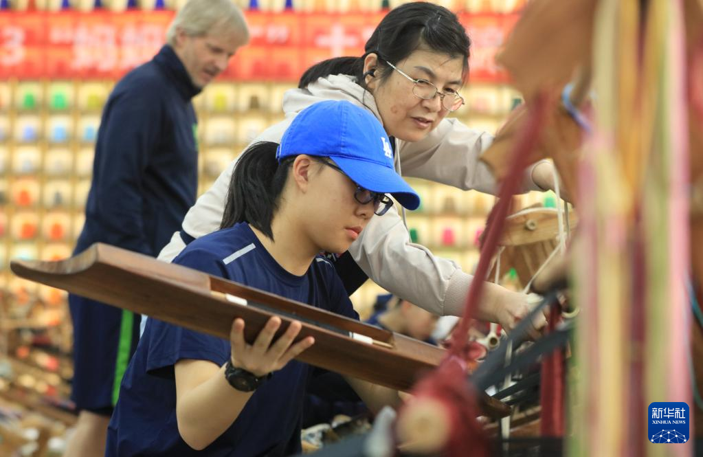 5月12日,來自上海包玉剛實驗學校的學生在張家界市武陵源區乖幺妹土家族織錦基地學習體驗土家族織錦非遺技藝。