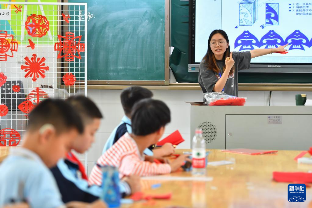 5月15日,在長沙市天心區紅衛小學,老師在剪紙藝術課上為學生講解剪紙技巧。