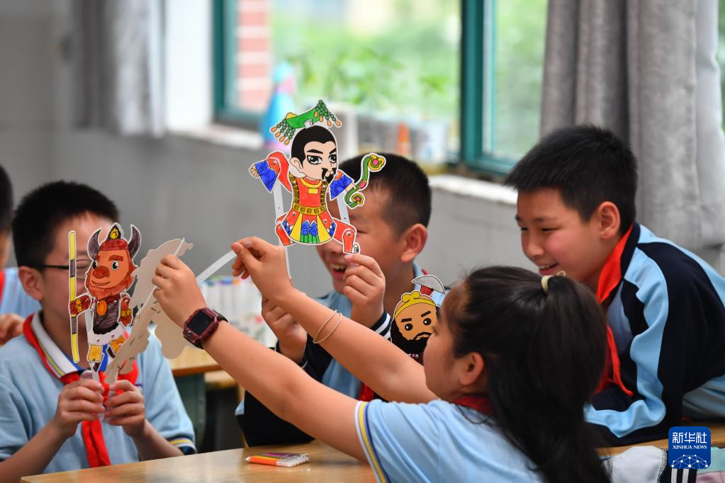 5月15日,在長沙市天心區紅衛小學,學生在皮影戲課上相互展示自己制作的皮影戲道具。