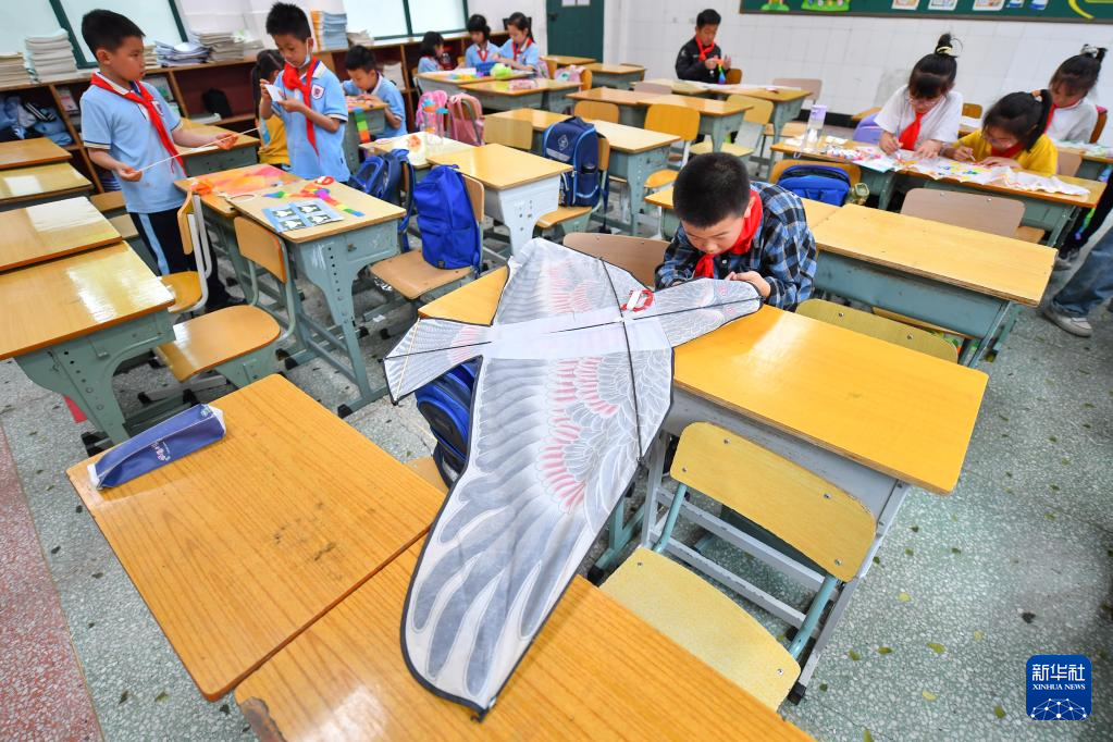5月15日,在長沙市天心區紅衛小學,學生在手工風箏課上體驗風箏制作。