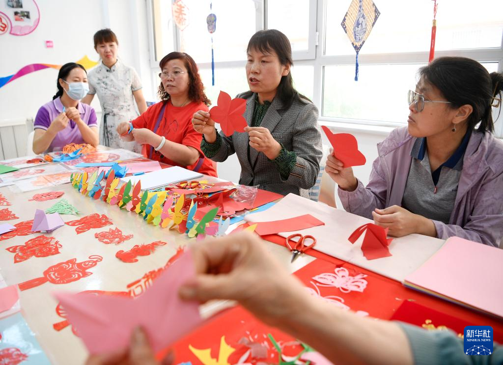 5月17日,老師(左一)向居民傳授剪紙技藝。