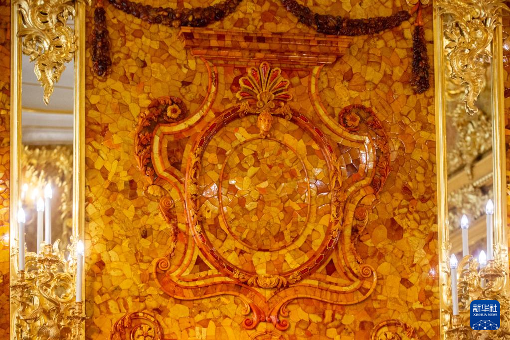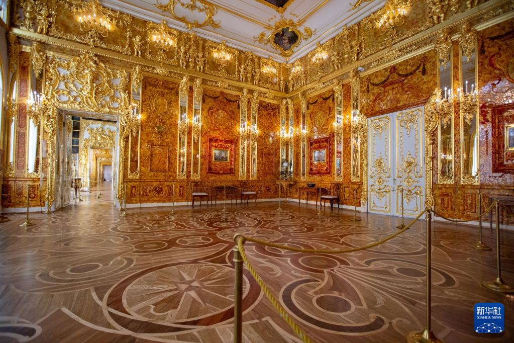 這是5月16日在俄羅斯圣彼得堡市附近的皇村國立博物館拍攝的葉卡捷琳娜宮琥珀廳。
