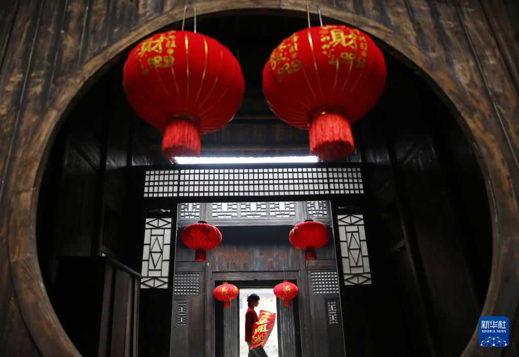 村民在湖南省常寧市中田村古民居內掛燈籠(3月3日攝)。