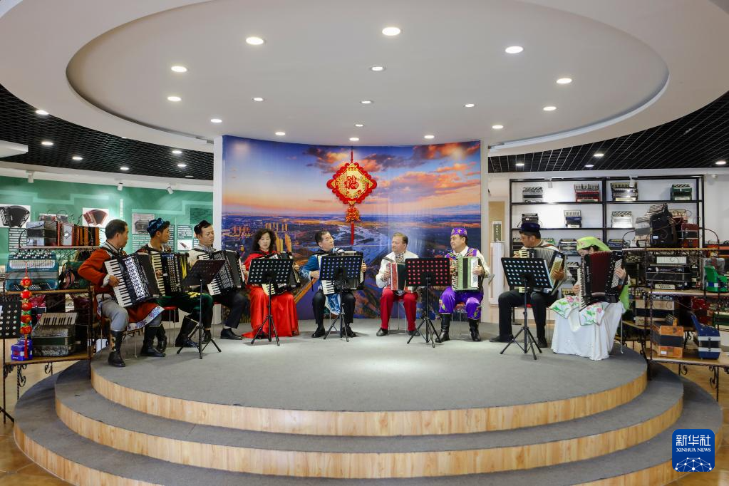 在位于伊寧市六星街的亞歷山大手風琴珍藏館,手風琴樂隊在為游客演出(5月16日攝)。