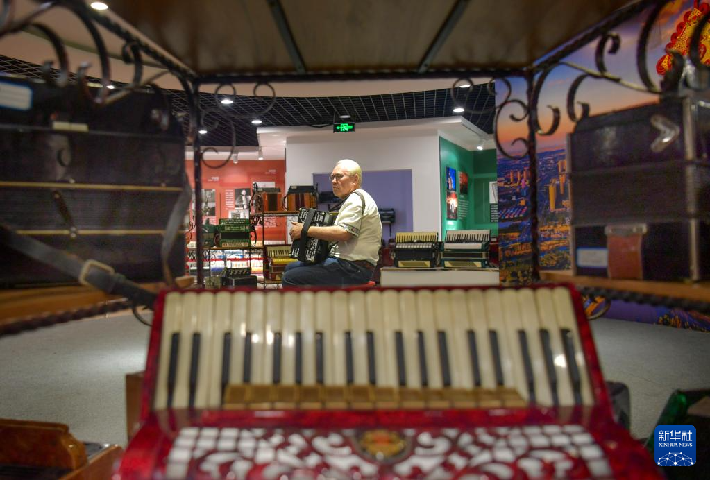 在位于伊寧市六星街的亞歷山大手風琴珍藏館,亞歷山大·謝爾蓋維奇·扎祖林在為游客表演(5月16日攝)。