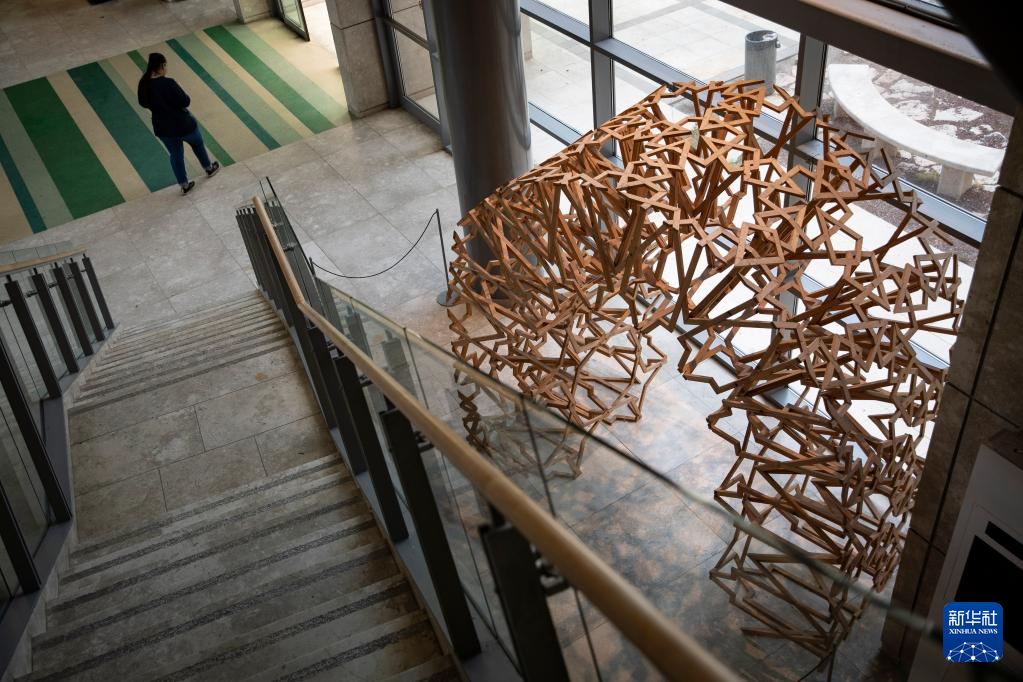 這是5月16日在以色列拉馬特甘巴爾伊蘭大學的費特納米科學與藝術博物館拍攝的裝置藝術作品。該作品呈現了納米超疏水材料的特性。