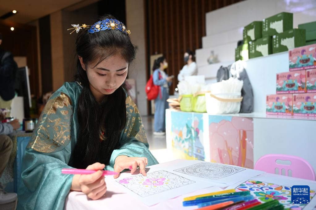 5月18日,觀眾在紙張上進行文物紋樣涂鴉。