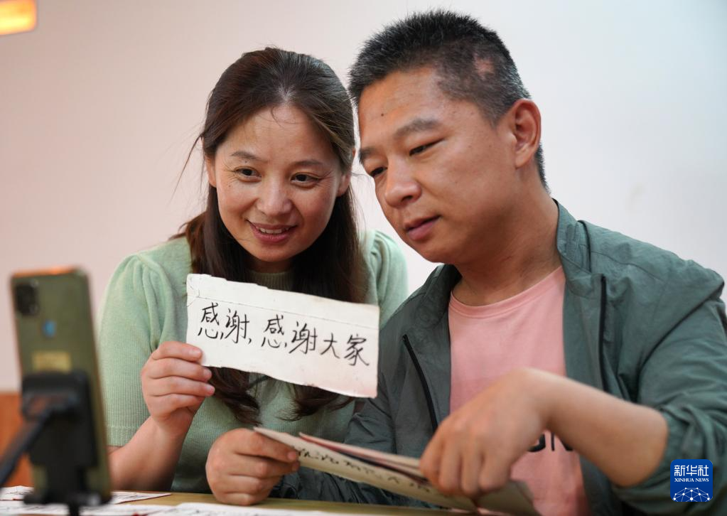 5月16日,谷穗(左)在非遺傳習基地和學徒一起直播。