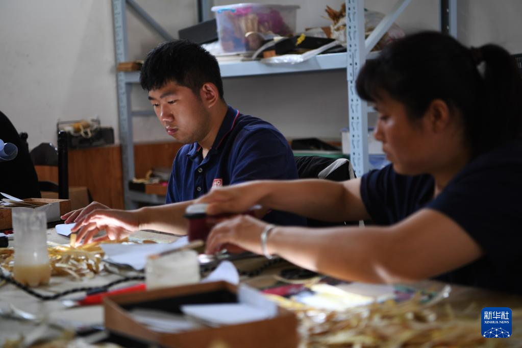 5月16日,谷穗(左)與葛磊(右)在非遺傳習基地一同研討制作工藝。