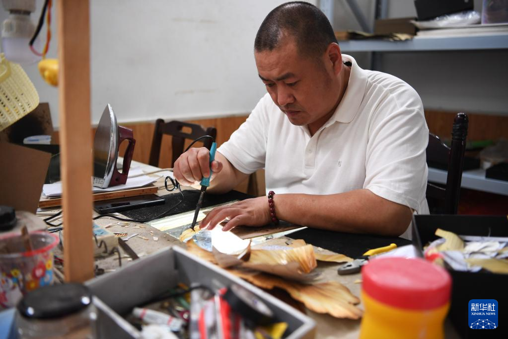 5月16日,葛磊在非遺傳習基地制作蘆葦畫時進行烙燙。