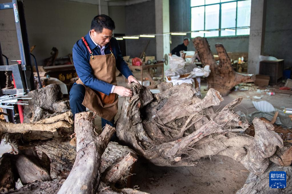 5月23日,在洞口縣巖山鎮陽家山村,洞口木雕非遺傳承人傅立先在挑選木雕材料。