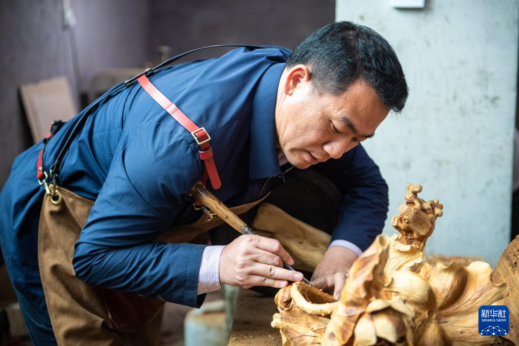 洞口木雕發祥于湖南省邵陽市洞口縣,歷史悠久,上個世紀80年代以來,洞口木雕產品遠銷海外。傅立先是洞口木雕非遺傳承人,他的爺爺傅滿山和父親傅金林曾是木雕工藝廠的老師傅。近年來,傅立先對洞口木雕的創作方向進行新的探索,把傳統工藝與現代文化相結合,創作出很多精美的木雕作品。